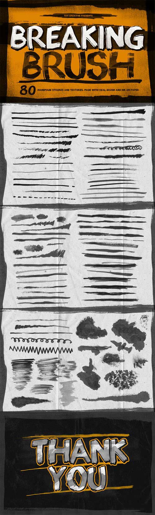Breaking Brush is bundle of 80 handmade strokes and textures. Made with real brush and ink on paper and then scaned in 600 DPI. 80 strokes and textures available in PSD and transparent PNG format. Each strokes and textures have different size, between 1000 - 4000 pixel but most of them are 4000 pixel.