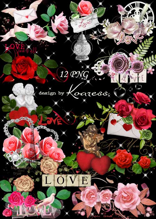 Набор романтических кластеров для фотошопа к Дню Всех Влюбленных с алыми сердцами, цветами, словами и любви